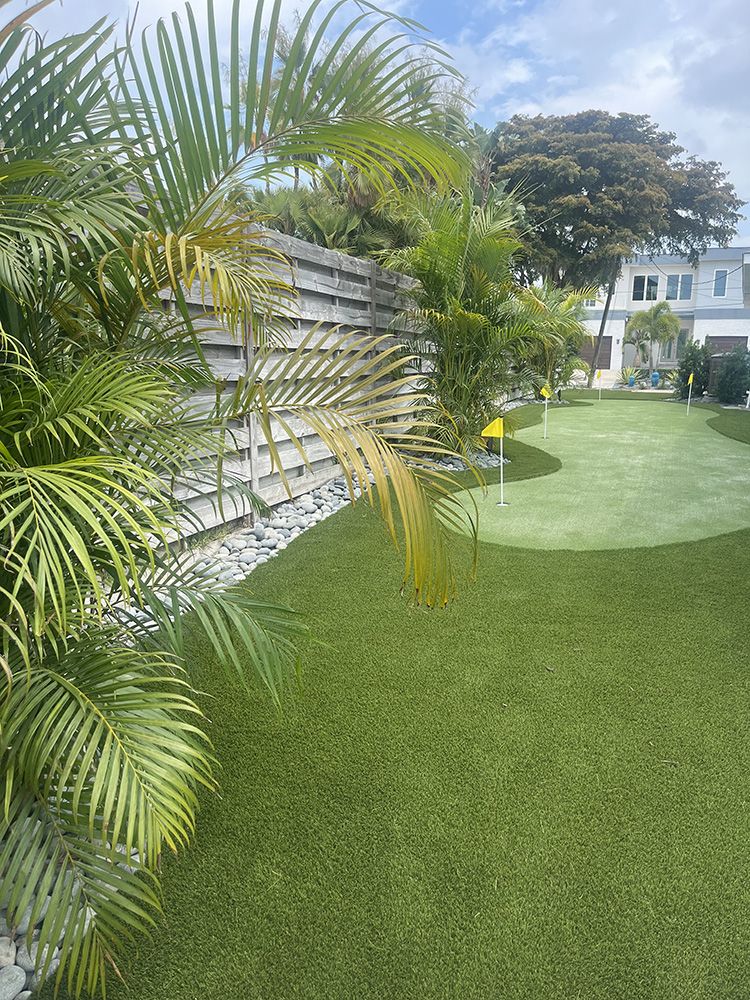 Putting Green Installation: A custom artificial turf putting green gives this Sarasota property a recreational feature that's both low-maintenance and visually appealing. Siesta Key Landscape specializes in artificial turf for putting greens, combining lush texture with performance.